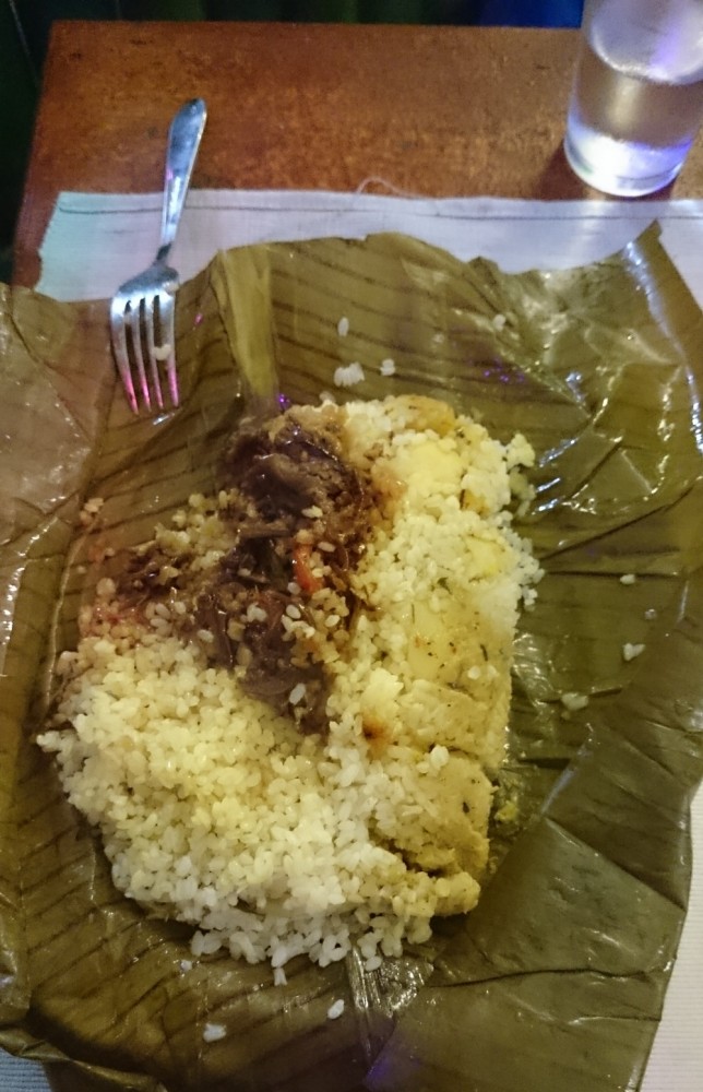 Und ein paar Tage später gab’s eine Spezialität , Reis mit Gemüse im Bananenblatt 2 Stunden gegart