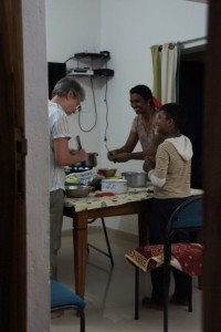 An einem Abend aßen wir bei unserer Familie und ich durfte mithelfen Gemüse schneiden und beim Kochen zuschaun. Das anschließende Mahl war sehr üppig: Reis, Fladen, Papadam, Linsendhal, Gemüsecurry, Kokossambal, grüne Bohnen. Und Bananen.