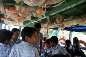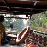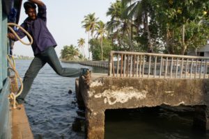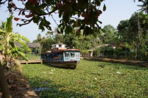 von Kottayam aus fuhren wir mit der öffentlichen Fähre – 0,50€ Fahrgeld für uns beide! 2 1/4 Stunden nach Alleppey. Das Boot war voller Schulkinder, die teilweise eineinhalb Stunden Schulweg haben. Der alte Kahn hatte irgendwann keinen Speed mehr, der Motor fing an zu rauchen und wir legten bei einer Haltestelle an. Mit einem Eimer Wasser wurde gekühlt, mit einem Kleiderbügel rumgeschraubt und zum Schluss musste ein Bootshifi in der Unterhose ins Wasser und unter’s Boot tauchen, um die Schraube vom Grünzeug zu befreien. Ansonsten war es eine wunderschöne Fahrt.