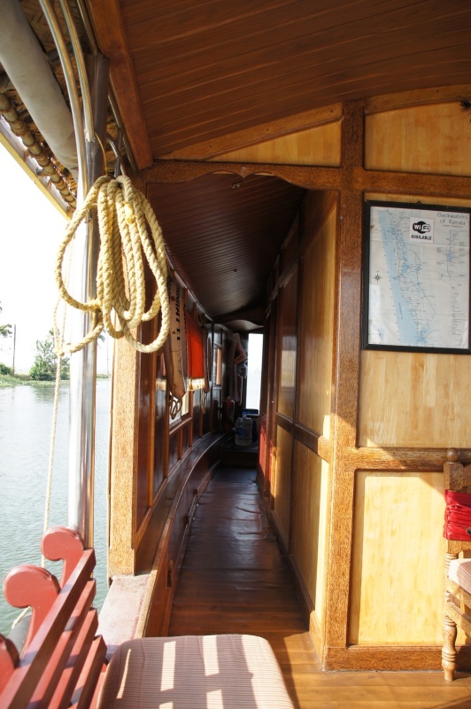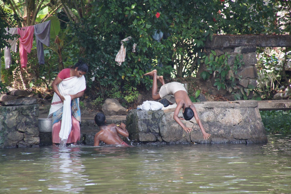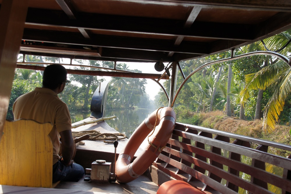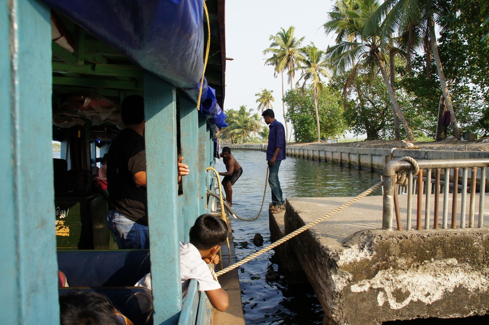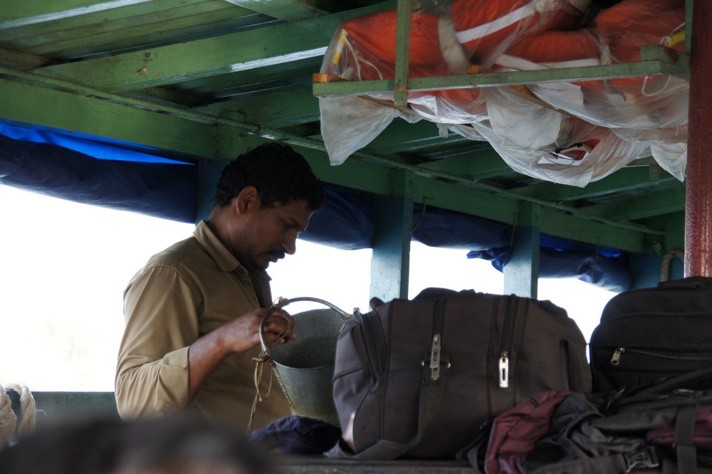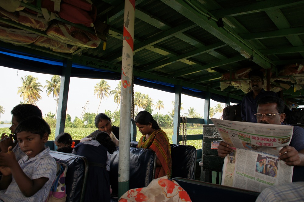 von Kottayam aus fuhren wir mit der öffentlichen Fähre – 0,50€ Fahrgeld für uns beide! 2 1/4 Stunden nach Alleppey. Das Boot war voller Schulkinder, die teilweise eineinhalb Stunden Schulweg haben. Der alte Kahn hatte irgendwann keinen Speed mehr, der Motor fing an zu rauchen und wir legten bei einer Haltestelle an. Mit einem Eimer Wasser wurde gekühlt, mit einem Kleiderbügel rumgeschraubt und zum Schluss musste ein Bootshifi in der Unterhose ins Wasser und unter’s Boot tauchen, um die Schraube vom Grünzeug zu befreien. Ansonsten war es eine wunderschöne Fahrt.