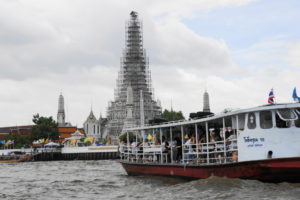 Wieder mit dem Boot – in der Zwischenzeit kennen wir uns aus und fahren nur mit der orangen Linie – steigen wir diesmal richtig aus und fahren mit der Fähre auf die andere Flussseite zum Wat Arun. Ein großer Tempelkomplex, alles mit chinesischen Keramik- und Porzellanscherben.