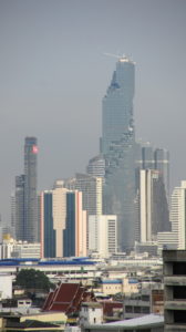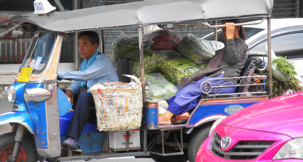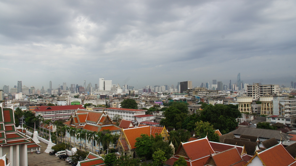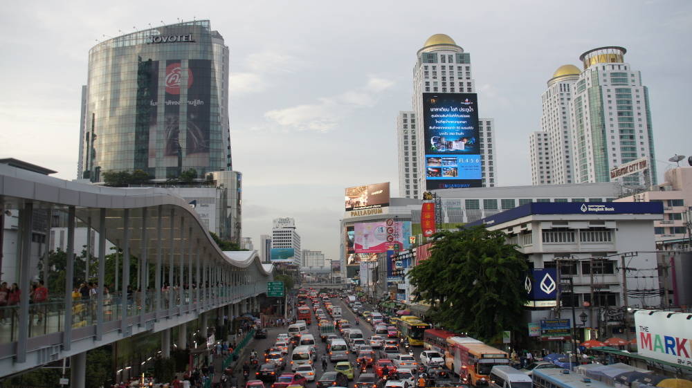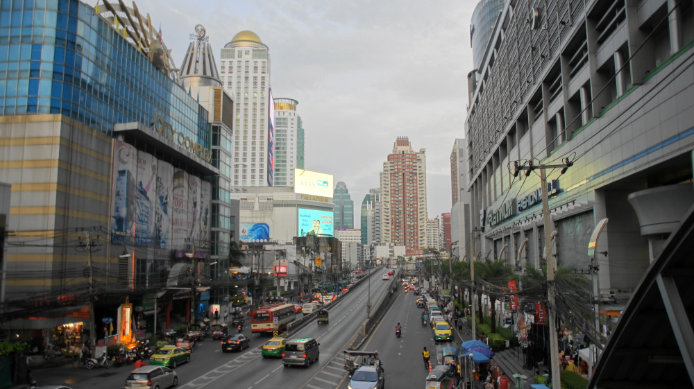 Bangkok: Schwül, sauber, fast keine Müllhaufen, viel Verkehr, aber nicht hektisch und laut wie in Indien. Es hupt niemand!! Es gibt viele Ampeln, und alle halten bei rot! Meistens! Niemand will dir ein Zimmer vermitteln, die Schlepper stehen nur vor den Restaurants und Massagestuben. Überall gibt es Stände zum Essen, Tische und Stühle stehen auf dem Gehweg oder der Straße. Verhungern kann man hier nicht. Es regnet ein- bis zweimal am Tag, heftig aber kurz.