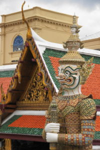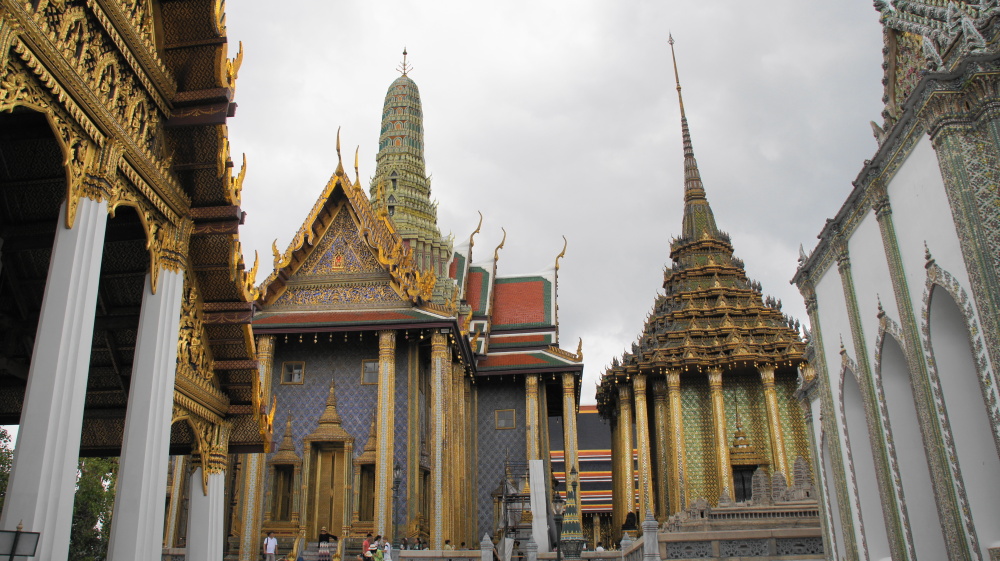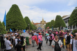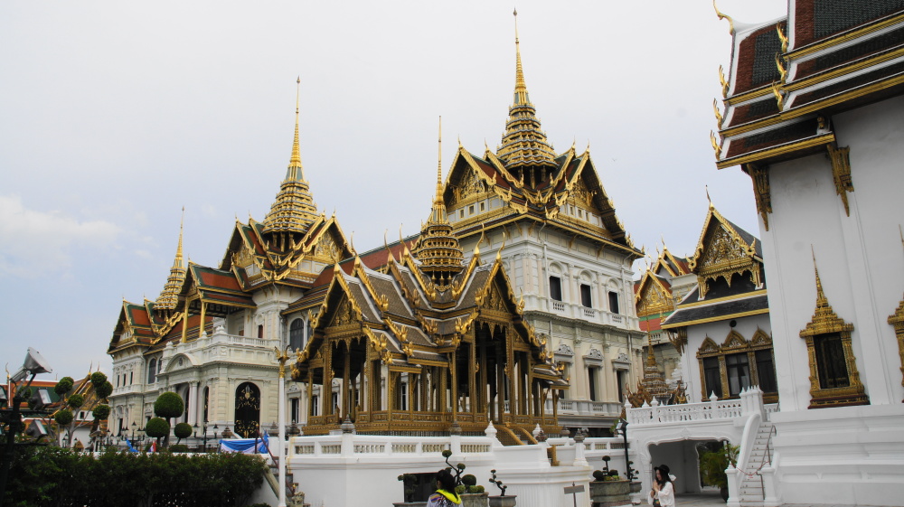 Von dort zu Fuß bis zum Königspalast. Dort laufen jeden Tag ca. 20.000 Leute durch. Und wir mittendrin. In langen Hosen und mit Tuch über den Schultern. Wir kommen bis zum Eingang durch, dann muss ich zurück, eine Bluse ausleihen. Und hier beginnt der Bürokratismus: 200 Bath bezahlen, ein Zettel mit Durchschlag wird ausgefüllt, der unterschrieben werden muss. Mit einem Zettel bekommt man die Bluse. Beim Zurückgeben wird der Zettel abgestempelt, bei der Kasse bekommt man den Durchschlag mit dem drangehefteten Geld zurück! Natürlich nur gegen Unterschrift! ( Tomi: war mei Frau saua, wia a kloans Kind, guad, dass sie kona ogsprocha hat, hät a Drama gebn ). Der Palast wurde 1782 erbaut, ist 20ha groß und wird heute noch teilweise von der Königsfamilie und für offizielle Gelegenheiten benutzt.