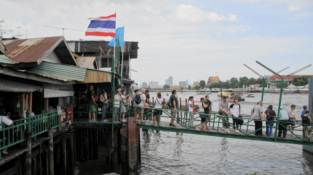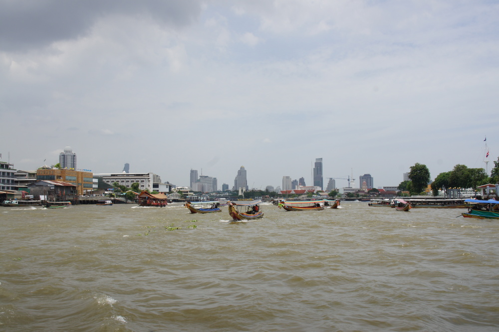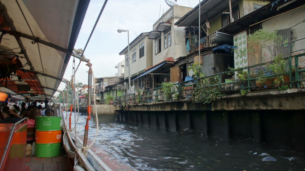 Anschließend fuhren wir mit dem Boot auf einem Kanal, dem Klong, in die Innenstadt. Das Wasser stinkt fürchterlich und das Boot fährt so schnell, dass manchmal Wasser hereinschwappt. Aber es ist die schnellste Art in die Innenstadt zu kommen, auf den Straßen ist immer Stau.