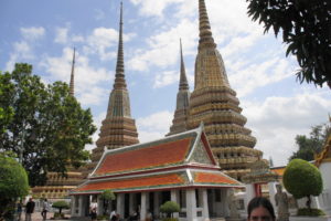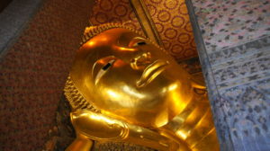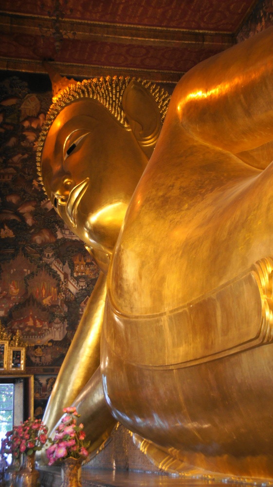 Und weil ein Tempel am Tag nicht reicht, besichtigen wir gleich noch den Wat Pho mit dem liegenden Buddha. Der ist 45m lang und 15m hoch und vollständig vergoldet.