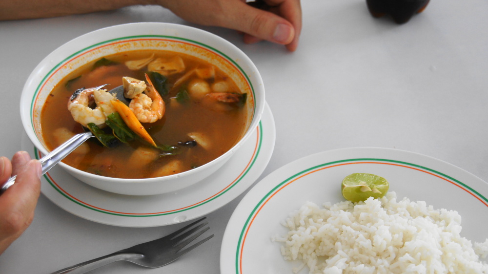 Tomi hatte zwar was anderes bestellt, aber die Suppe mit Garnelen war einfach köstlich!  Preis mit einer Portion Reis: 1,85€