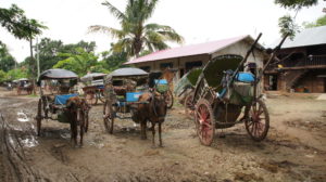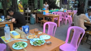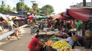 sehen. Hellhäutige Touristen kaum vorhanden. Mit einem Sammeltaxi wurden wir direkt vor unser Hotel gefahren. Wir hatten nicht vorgebucht und konnten einen guten Preis aushandeln. Das Hotel ist in die Jahre gekommen, die Zimmer geräumig, das Bad sauber. Auf der Dachterrasse gibt’s Frühstück und abends Marionettentheater. In den Straßen rund um das Hotel gibt es viele kleine Häuschen und öffentliche Wasserstellen, wo die Leute sich und ihre Wäsche waschen. Die Straßen selbst sind völlig marode, Gehwege gibt es nicht und nach Regenfällen geht man durch Matsch. Überall gibt es Obst- und Gemüseverkauf und viele Essensstände. Tomi kann sich damit garnicht anfreunden, es gibt viel Schwein, das Meiste undefinierbar. Innereien, Schwanzerl, Füße, Ohren und einiges mehr, das wir nicht kennen (Organe ?). Dafür gibt’s wieder viel Fettgebackenes und jede Menge frisches Obst. Und die gebackenen Fladen, die wir aus Indien kennen. Ein Fladen mit Kartoffelfüllung kostete 15Cent! Die Leute sind alle sehr freundlich, sie lachen uns an und wir müssen uns wieder fotografieren lassen. Unterwegs in der Stadt trafen wir so gut wie gar keinen Touristen und abends sowieso nicht.