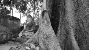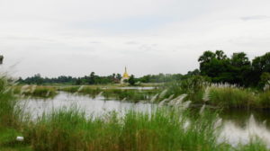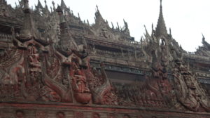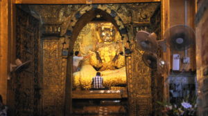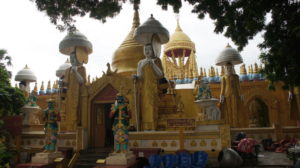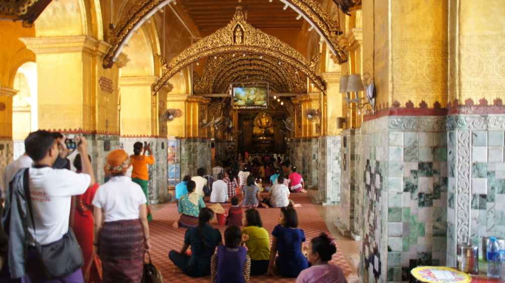 Heute ist es brutal heiß. Der Himmel ist zwar bedeckt, aber wir nutzen jede Schattenstelle aus. Und hin und wieder kommt ein Lüfterl, das ist angenehm. Wir gehen zu Fuß zur Mahamuni Pagode. Sie wurde 1784 erbaut und im Inneren steht die älteste und größte bronzene Buddhastatue aus dem Jahr 146 n.Chr. Sie ist 4m hoch und die Gläubigen – nur die Männer – dürfen Goldplättchen auf die Figur auflegen. Die Goldschicht ist mittlerweile ungefähr 15cm dick.