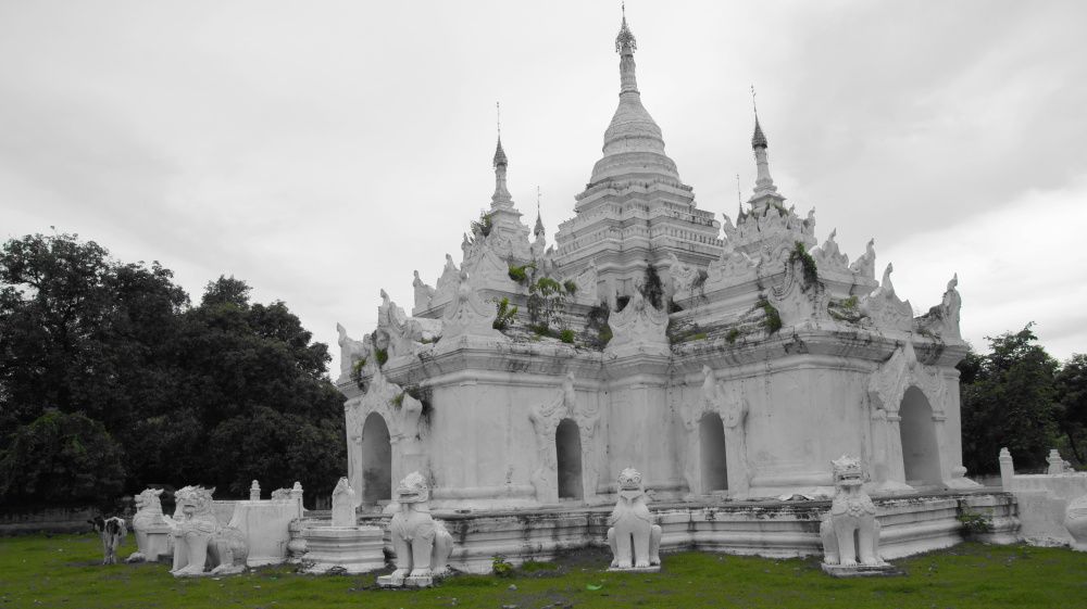 Ein Stück weiter besichtigen wir die Kuthodaw Pagode. Rund um die weiße Stupa stehen 729 kleine weiße Pagoden mit Marmortafeln, auf denen buddhistische Lehrtexte eingemeißelt sind.