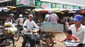 Essen: In den Straßenküchen gab es nicht viel Auswahl, Baguette mit bisschen Salat und undefinierbarer Wurst, gegrillte Würstchen oder Spießchen mit ???, Nudelsuppe und Eier. Wachteleier, Hühnereier, hart gekocht, als Spiegelei auf Reis und Nudeln. Das Abartigste waren gekochte Entenembryos in der Schale. Gebratene Maden oder Heuschrecken essen hier auch die Einheimischen. Wenn wir Glück hatten, fanden wir gegrillte Schweineschwarte. In den Restaurants bekam man wenigstens Reis oder Nudeln mit Gemüse, aber was so in den Töpfen schwamm, sah meistens nicht so appetitlich aus. Drum ging es uns in Siem Reap oder Phnom Penh recht gut, da gab’s in den Restaurants mehr Auswahl, auch mal eine Pizza oder Fröschlein. Auf dem Markt oder an Standln gibt es alles Mögliche an Obst, z.B. Ananas, Pomelo, Mango und vieles mehr, schon fertig aufgeschnitten und in Plastik verpackt. Für uns ganz praktisch, aber auch die Kambodschaner versorgen sich damit. Und für das Abendessen zu Hause wird oftmals das fertige Essen in Plastiktüten mitgenommen.