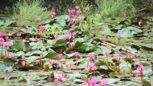 Klima: Wir waren in der Regenzeit unterwegs, meistens hat es einmal am Tag richtig stark geregnet. Aber es gab dazwischen auch trockene Tage. Die Landschaft war üppig grün, die Reispflanzen teilweise schon abgeerntet. Der Reis lag auf großen Planen vor den Häusern auf der Straße und wurde getrocknet. Überall waren Tümpel mit weißen, rosa, lila oder blauen Seerosen. Nach den Regengüssen stand das Wasser in den Grundstücken, manchmal waren die Straßen überschwemmt. Der Vorteil der Regenzeit: es waren nicht soviele Touristen unterwegs. Man bekam immer ein Zimmer und beim Besichtigen, außer in Angkor Wat, war man fast allein. Es war jeden Tag drückend und schwül, dadurch waren wir abends meistens ganz schön erledigt.