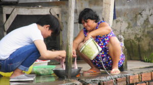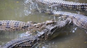 Mekongarme und durch Kanäle zu einer Insel. Runter vom Boot, rein in eine offene Halle. Hier werden Kokosnuss-Bonbons hergestellt. Unser Reiseleiter erklärt uns den Vorgang. Wir können ein paar süße Guttis probieren und danach dürfen wir einkaufen. Nach einer halben Stunde müssen wir wieder an Bord. Weiter geht die Fahrt, die nächste Insel wird angesteuert. Das selbe Spiel, alle runter vom Boot, in eine Halle, hier gibt es Honig zu probieren und zu kaufen. Außerdem kann man sich eine Python um den Hals hängen, ganz schön schwer! Und nach einer halben Stunde geht’s weiter. Auf der 3. Insel fängt es an zu regnen, alle kaufen sich bunte Plastikumhänge und steigen in kleine Boote, immer 4 Mann. Nach 10 Minuten Fahrt heißt es aussteigen, wir marschieren zu einer offenen Halle. Dort gibt es Obst, Ananas, Pomelo, Papaya, Drachenfrucht zum Probieren und kaufen. Wir fahren noch eine weitere Insel an, dort gibt es Mittagessen. Reis mit dünnen Stückchen Schwein und Suppe. Jetzt haben wir sogar 1 1/4 Stunden Zeit, nach dem Essen können wir einige Krokodile anschauen und ein bisschen durch die Insel schlendern. Nach einer kurzen Fahrt mit dem Boot steigen wir in unseren Bus und fahren nach Can Tho. Wir werden zu einem Hotel gebracht, beziehen die einfachen Zimmer. Tomi und ich gehen zum Essen in eine Nebenstraße. Dort sitzen wir noch gemütlich bei einem Bier und sind von der ganzen Fahrerei so müde, dass wir bald ins Bett gehen.