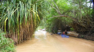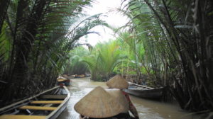 Wir wollen ins Mekongdelta und erkundigen uns nach einem Bus nach Ben Tre. Es gibt keine Direktverbindung, wir könnten im Rahmen einer Tagesfahrt dort hin und bleiben. Als Alternative bietet sich eine 2-Tagesfahrt mit Übernachtung an. Dafür entscheiden wir uns und buchen die Gruppentour, um das auch mal auszuprobieren. Der Mekong fächert sich im Delta in 9 Mündungsarme auf. Es gibt dazu viele Kanäle und Sümpfe und die Gegend ist sehr fruchtbar. Überall sieht man Reisfelder, Bananen-, Drachenfrucht-, Gemüseplantagen und natürlich Kokosnusspalmen.