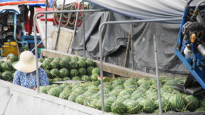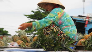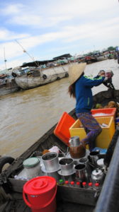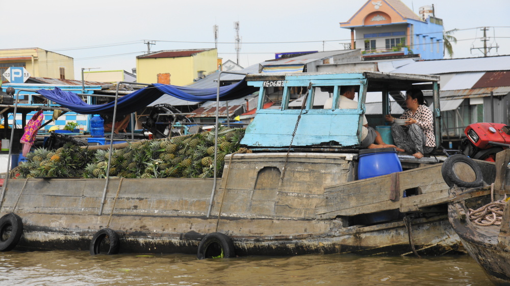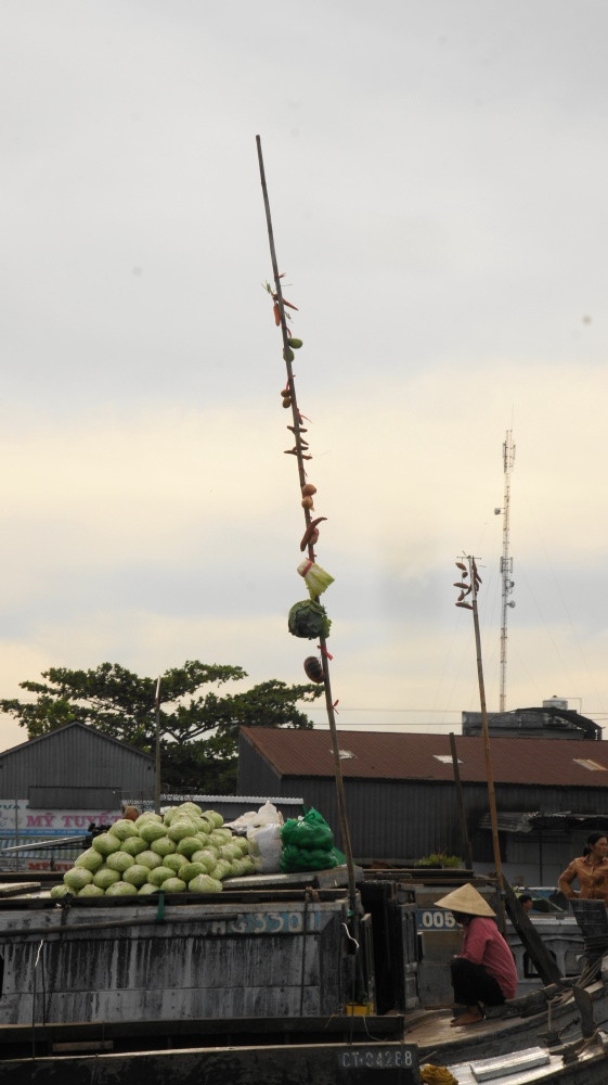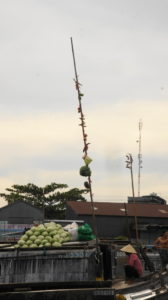 Das Frühstück war ein Graus, wir warten in der Früh ewig auf unseren Bus. Und dann fahren wir 10 Minuten und werden zum Boot gebracht. Damit geht es zu einem schwimmenden Markt. Auf den Schiffen wird das Obst und Gemüse in großen Mengen verkauft, die Zwischenhändler bringen die Waren zu kleineren Märkten. An hohen Stangen wird angezeigt, was verkauft wird. Auf den Booten leben die Leuchte auch. Wir sind noch garnicht richtig zwischen den Booten, da kommen schon von rechts und links Osthändler mit Getöse angebraust und wollen uns was verkaufen. Ein Lärm und Geschrei. Allmählich wird es ruhiger und wir können uns alles anschauen. Natürlich halten wir an einem größeren Obstmarkt, wir können einkaufen.