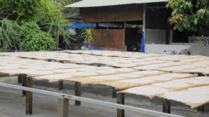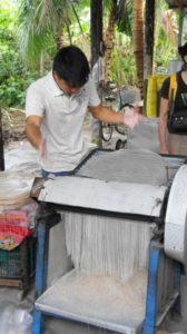 Wir werden zu einem Reisnudelherstellungsplatz gebracht. Reismehl wird mit Wasser gemischt, dünn auf eine heiße Platte gestrichen, mit einem Holzstab abgenommen und zum Trocknen auf Bastmatten gelegt. Nach einem Tag werden die dünnen Platten mit einer Maschine ganz fein geschnitten. Ist ganz interessant, klar, dass man was kaufen kann.