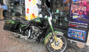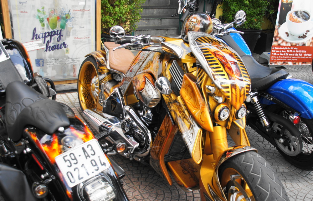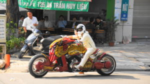 80% der Vietnamesen fahren Roller, auch wir stürzten uns für umgerechnet 8 Euro in den Verkehr, aber ein paar Erlesene fahren etwas Besonderes. Hier ist Helmpflicht.