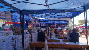 Wir kommen nicht weiter. Maren und Axel sitzen im Garten, als wir vom Frühstücken zurückkommen. Und da geht halt wieder ein Ratsch. Doch irgendwann gegen ein Uhr, treibt uns der Hunger mit den Radln zu den Essensstandln. Für mich gibt’s frische Frühlingsrollen, in der Zwischenzeit mein absoluter Favorit. Mit Gemüse gefüllt und mit scharfer Soße zum Eintauchen. Zum Frühstück gibt es die Tage immer Sandwich mit Käse (Streichkäse!) und Salat. Für Tomi mit gebratenem Hühnchen, Salat und scharfer Soße.