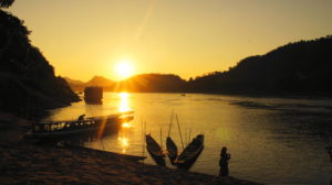 Und abends ganz romantisch Sonnenuntergang am Mekong mit Chips und Bier.