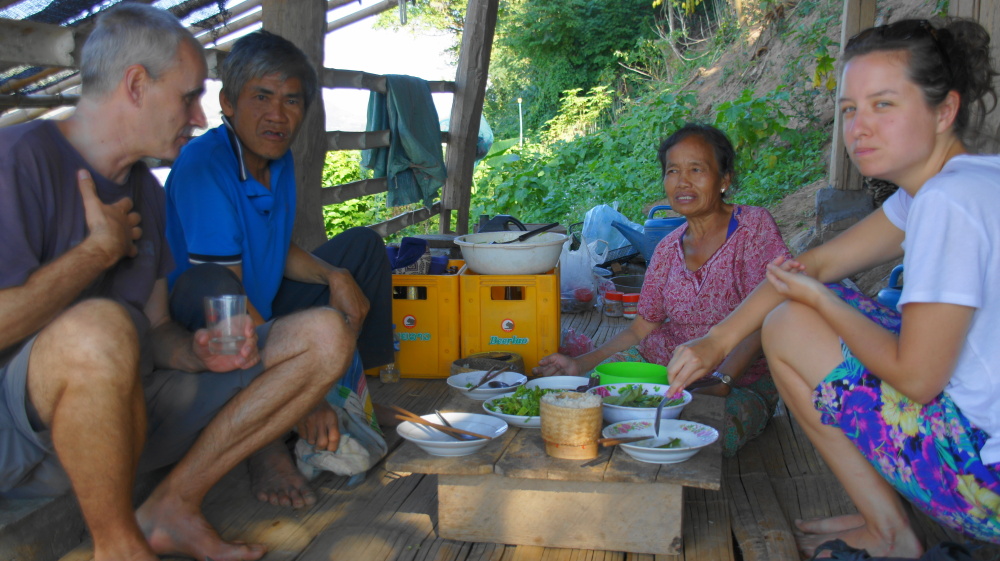 Wir machen einen kurzen Spaziergang, trinken Sojamilch bei einer Frau, die grad lange, dünne Kerzen für den Tempel macht. Auf dem Rückweg kommen wir an einer Holzbehausung vorbei. Dort sitzt eine junge Touristin und eine laotische Frau beim Bohnenschneiden. Der Ehemann winkt uns, wir sollen doch mithelfen. Wir setzen uns dazu und schauen, was da zum Essen gekocht wird. Es gibt Salat ( die junge Schottin sagt uns, der ist mit Mekongwasser gewaschen!), gekochte Bohnen und Reis. Wir sollen doch mitessen, aber vorher gibt es noch einen selbstgemachten Schnaps. Tomi sagt nicht nein, und es bleibt nicht bei dem einen. Natürlich ißt er auch den Salat! Mal schaun, wie es ihm heut Abend geht. Nach einer Stunde können wir drei uns loseisen.  Tomi: Mein Gastgeber hat gemeint, ich soll bei ihm in seiner Hütte schlafen, die Versuchung war groß, der Schnapsvorrat wahrscheinlich auch : – )