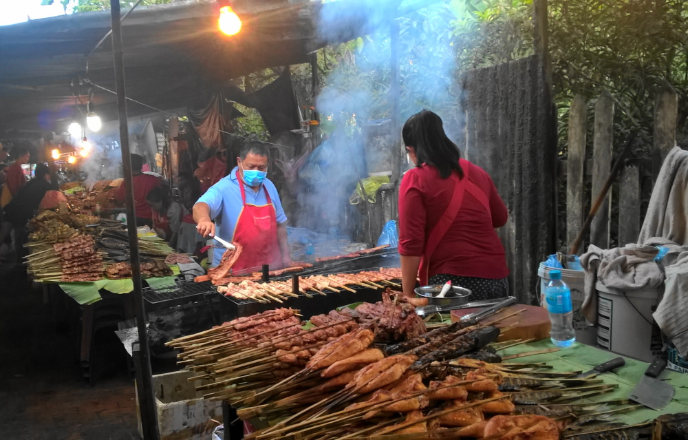 Wir kommen nicht weiter. Maren und Axel sitzen im Garten, als wir vom Frühstücken zurückkommen. Und da geht halt wieder ein Ratsch. Doch irgendwann gegen ein Uhr, treibt uns der Hunger mit den Radln zu den Essensstandln. Für mich gibt’s frische Frühlingsrollen, in der Zwischenzeit mein absoluter Favorit. Mit Gemüse gefüllt und mit scharfer Soße zum Eintauchen. Zum Frühstück gibt es die Tage immer Sandwich mit Käse (Streichkäse!) und Salat. Für Tomi mit gebratenem Hühnchen, Salat und scharfer Soße.