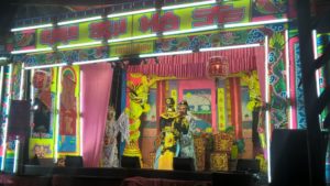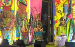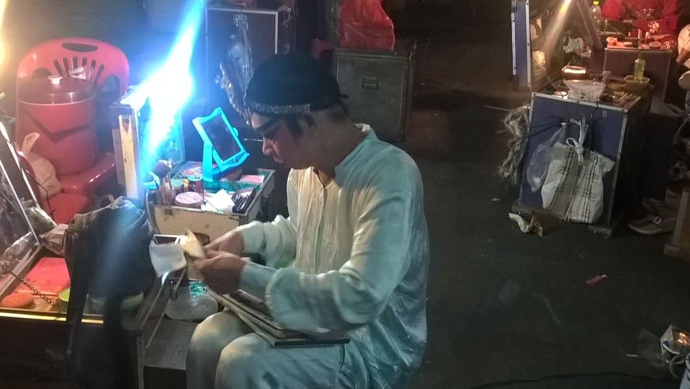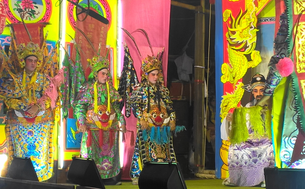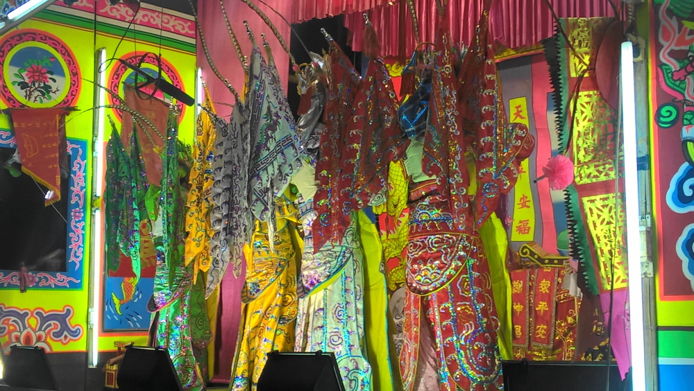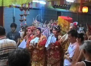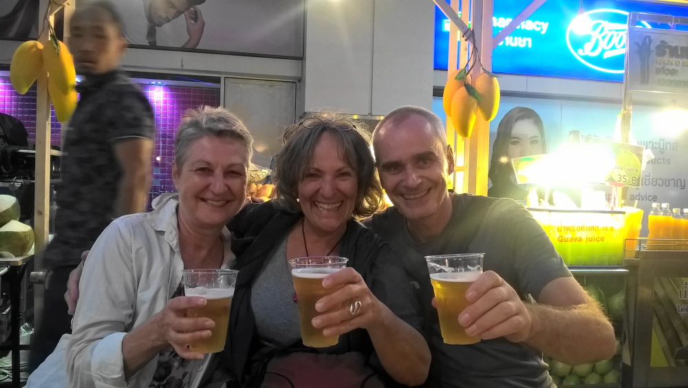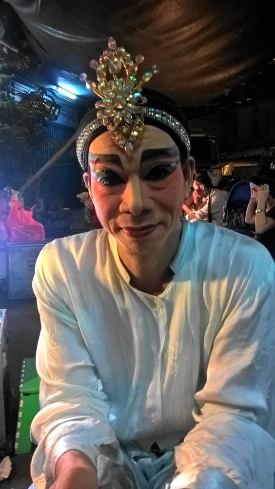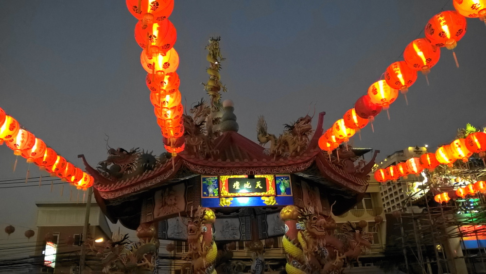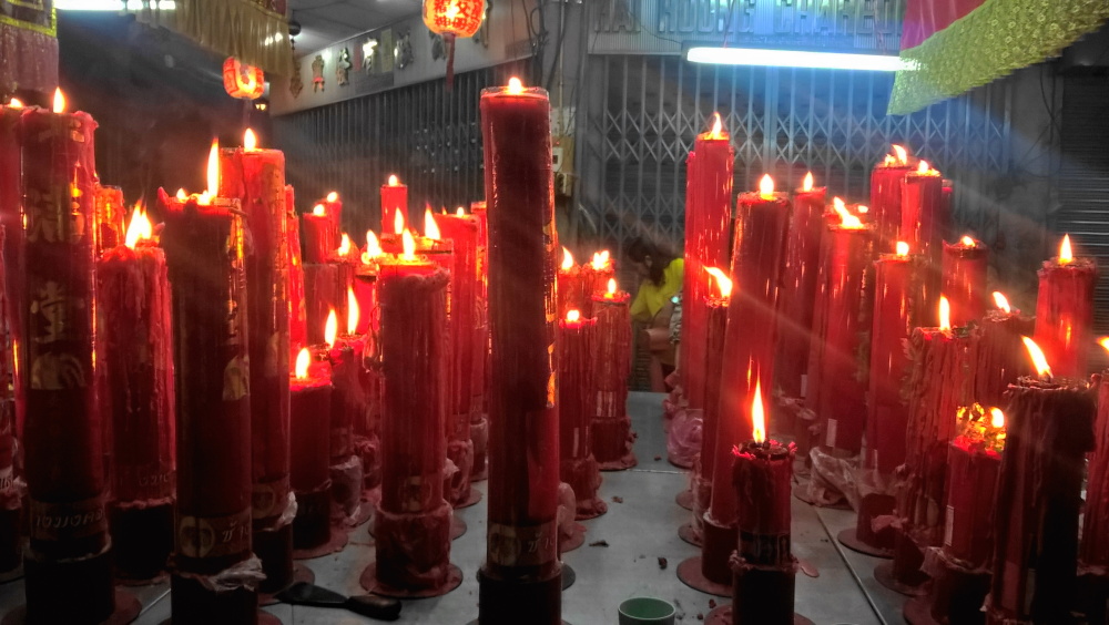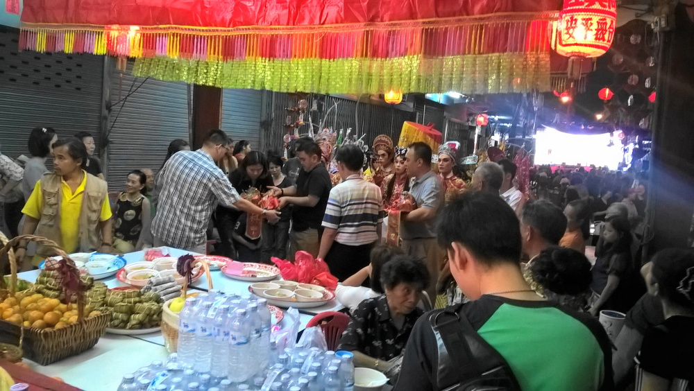 Flug nach Bangkok, wir checken wieder in das Hostel am Bahnhof ein, haben Großwäsche, gehen abends um’s Eck bei der Straßenküche gut essen. Man kennt sich halt aus. Zur Nachspeise probieren wir was Neues, große Brotwürfel, schmecken wie Rosinensemmeln, getränkt in Kokosmilch und zum Eintauchen eine dicke weiße Creme, schmeckt wie Pudding. Köstlich. Gleich gegenüber, in einer kleinen Seitenstraße, wird ein chinesischer Feiertag gefeiert. Mit Musik, Theater und Essen und Trinken. Wir bekommen ein selbstgemachtes Eis mit braunen Bohnen aufgedrängt, es ist das erste Eis, das ich in Asien esse, es schmeckt sehr gut und ich bekomme keine Schwierigkeiten.