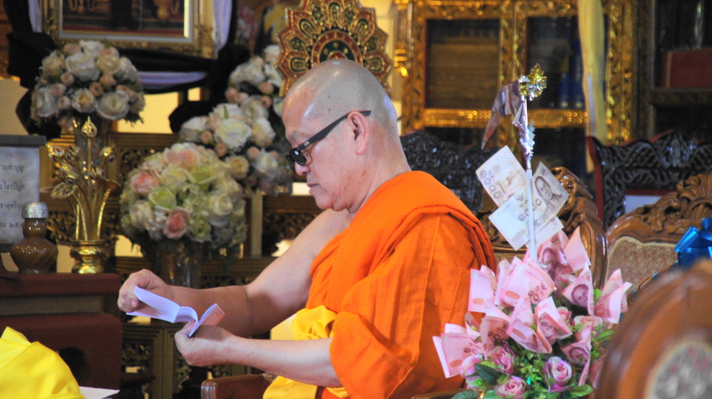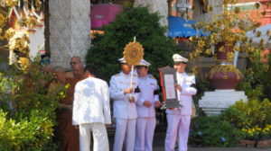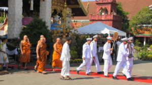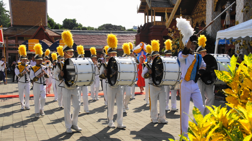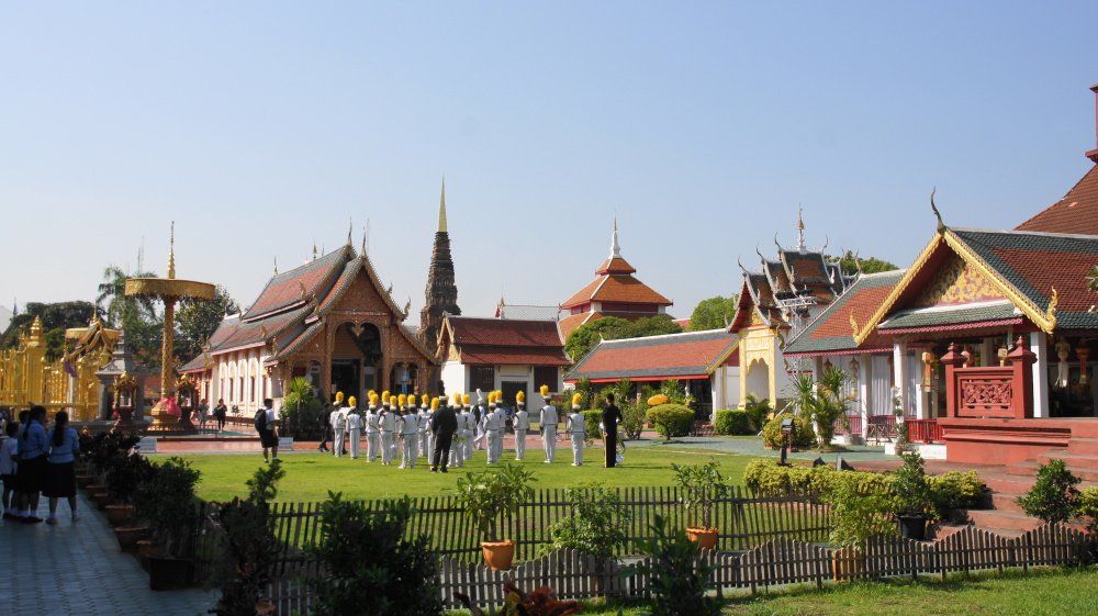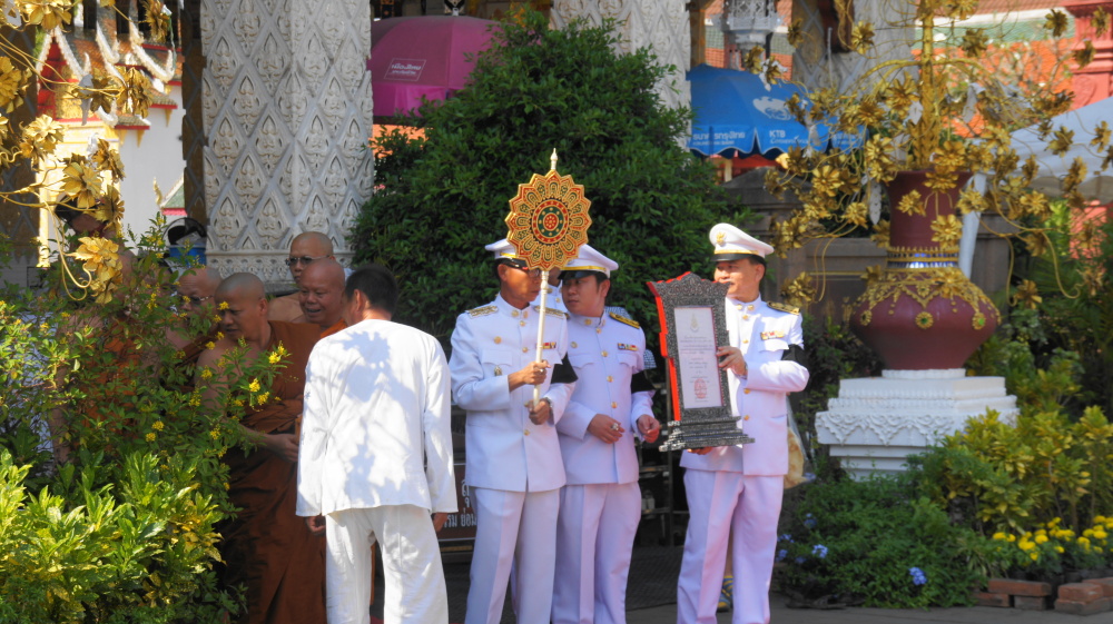 während wir besichtigen, kommen immer mehr Mönche und eine Musikkapelle. Und Weißuniformierte, die wohl vom neuen König irgendein wichtiges Papier dem Tempel überbringen. Wir freuen uns, dass wir das miterleben dürfen.