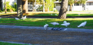 Der Platz hat eine große Küche mit Gasofen und Gasgrill. Wir brauchen unseren Kocher garnicht auspacken, das ist praktisch. Abends kommen Schwärme von weißen Kakadus und machen einen gewaltigen Lärm. Es gibt auch kleine grüne und schöne, bunte Papageien.