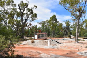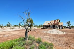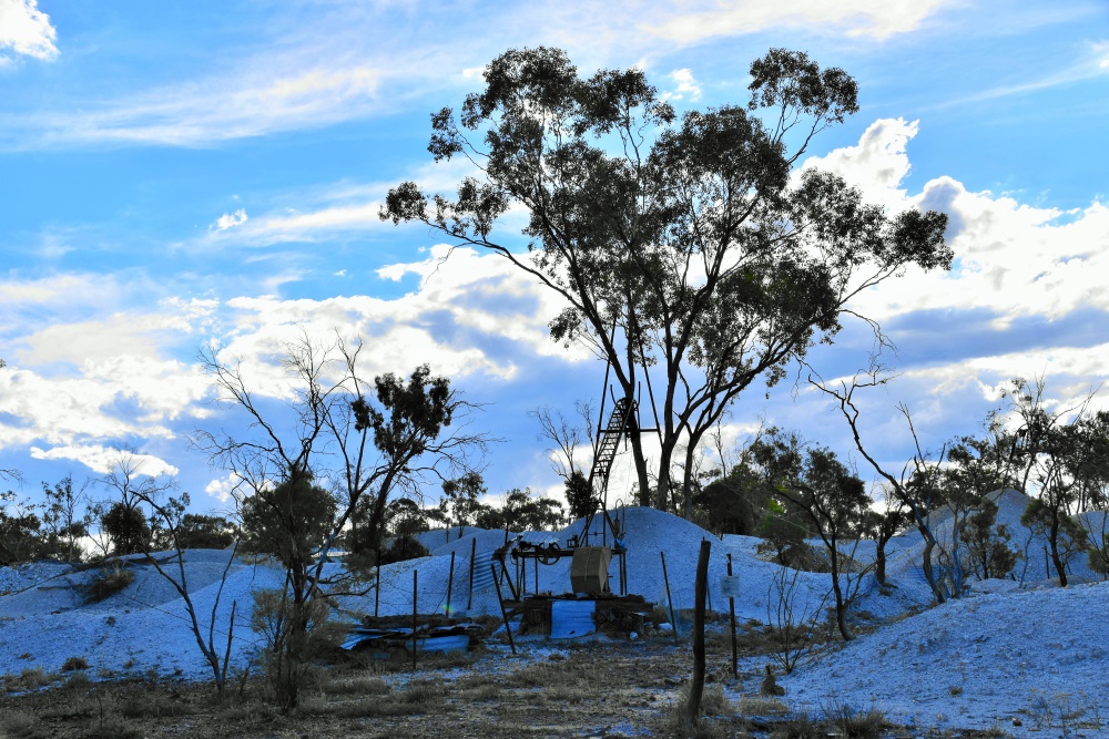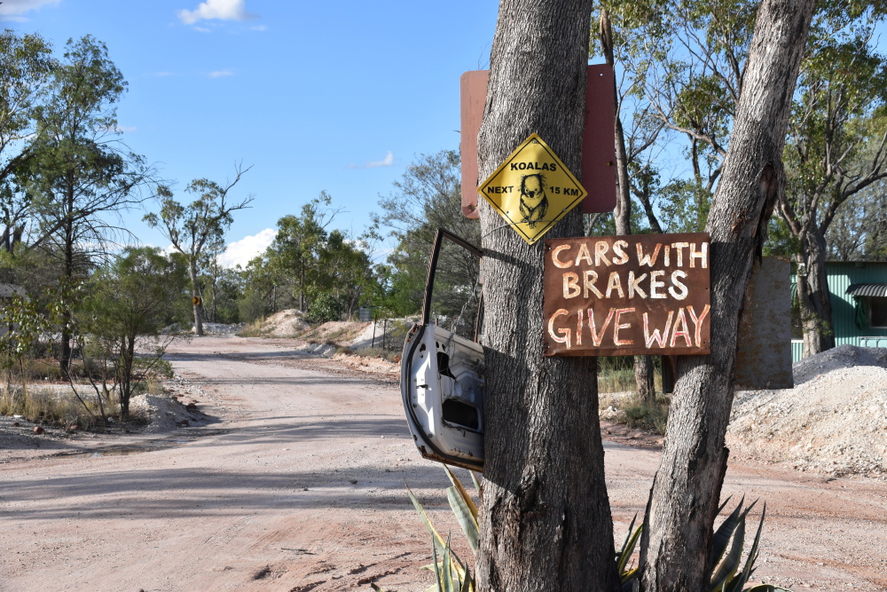 Wir verlassen das vulkanische Gebiet und kommen in eine Ebene mit riesigen Feldern und Weiden. Wieder schnurgerade Straßen, kaum Verkehr. Auf 50km unfestigter Straße kommen uns 4 Autos entgegen! Dafür steht plötzlich ein Schaf auf der Fahrbahn. Und wunderschöne, neongrüne Papageien mit rot-gelbem Bauch fliegen an uns vorbei. Kängurus sehen wir nur tot am Straßenrand liegen und die stinken fürchterlich. Es wird heiß, wir brauchen die Klimaanlage im Auto. Wir kommen nach Walgett und wollen einen Kaffee trinken. Der Ort ist wie ausgestorben, Cafe finden wir keins, wenigstens gibt es einen Supermarkt. Dort decken wir uns noch mit Wasser und Brot ein. Die Preise sind etwas höher als in den großen Supermärkten an der Küste. Auf einer Sandpiste geht es in ein Opalgebiet. Hier ist das größte Vorkommen von Opalen, auch die seltenen schwarzen Opale werden hier gefunden. Wir wollen in einen kleinen Ort, Grawin. Es gibt nur eine Staubstraße dorthin, überall sind große, weiße Steinhaufen, Blechbehausungen und Förderanlagen.