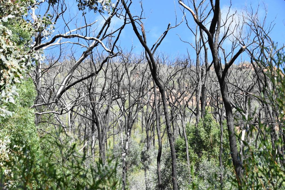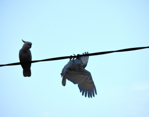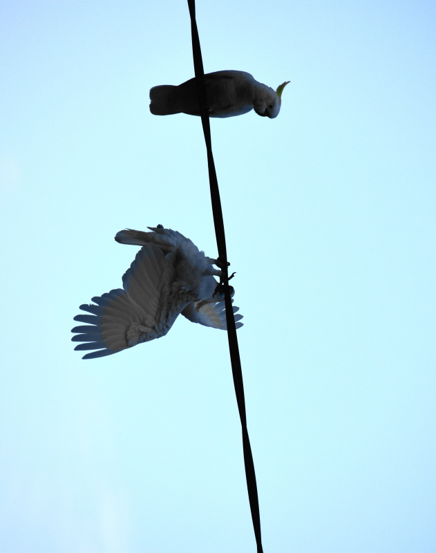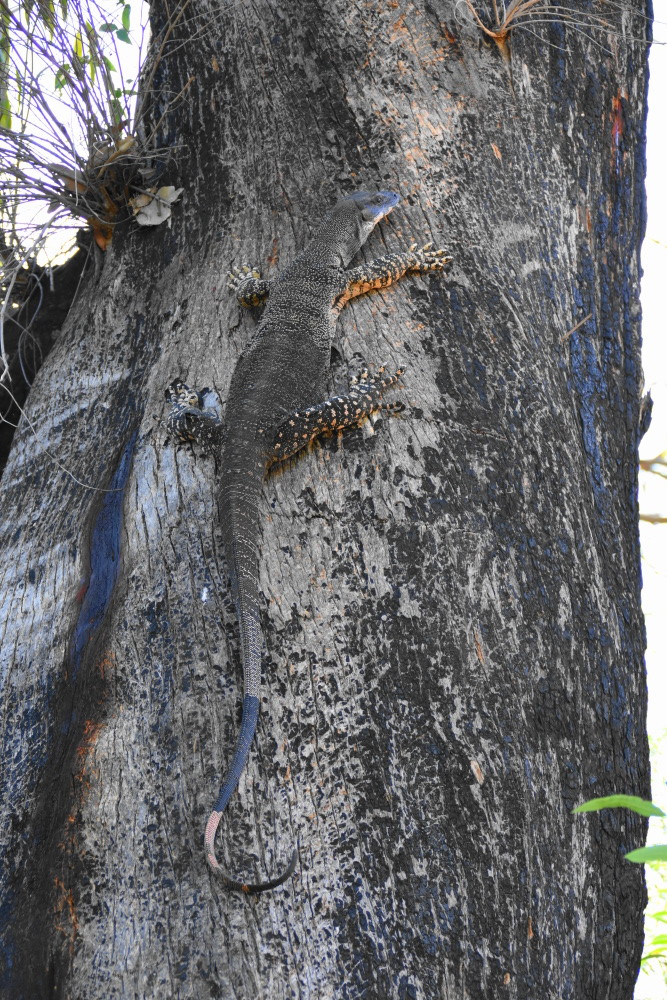 DSC_0286Die Sonne scheint immer noch! Wir bleiben noch und machen eine Wanderung zu einem Aussichtspunkt. Gleich am Anfang sehen wir einen Leguan, der ganz gemütlich einen Baum hinaufklettert. Der Weg ist nach dem Feuer wieder gut hergerichtet, wir gehen einen Bach entlang, leider ist kein Tropfen Wasser drin. Ich geh vorraus und schau, dass ich in keinen frischen Känguruschiss steige. Auf einmal schreit Tomi hinter mir: stopp!! Ich bremse und Tomi zeigt mir ein Spinnennetz über dem Weg mit einer dicken, schwarzen Spinne. Wenn er mich nicht gerettet hätte, wäre ich voll mit dem Gesicht ins Netz gelaufen. Nach dem Spaziergang belohnen wir uns mit einem Eis, für mich gibt es ein Magnum Pfefferminz! Total lecker. (2,70€). Es ist heiß, im Schatten kann man es gut aushalten. Auf dem Platz ist ganz still, die Kakaduschwärme schreien nur abends und morgens. Die Ameisen und Fliegen nerven ein bisschen, auch so aufdringliche Vögel, die dir am liebsten das Essen vom Teller nehmen würden.