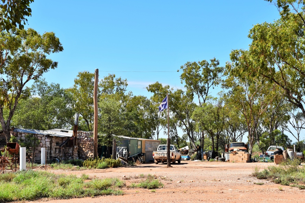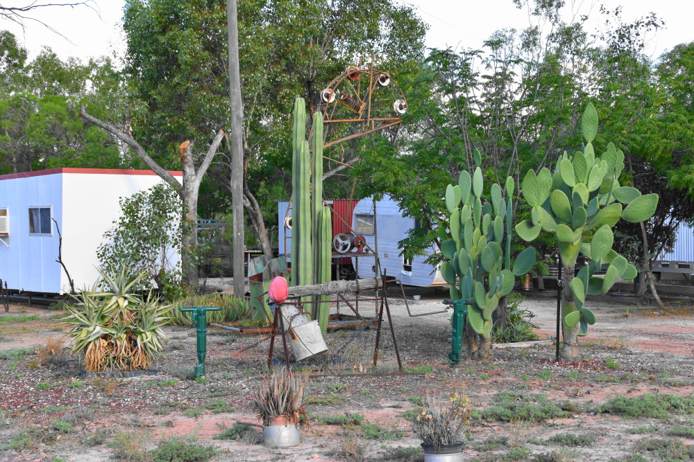 Das war die erste Nacht in Australien, in der wir die warme Zudecke nicht gebraucht haben. Es gibt eine Dusche, ich mach’s auf die indische Art mit Eimer und Schöpfer, Tomi mit der Campingdusche. Zum Kaffeetrinken fahren wir in das 2. Pub Sheedyards und können uns von ein paar „Kumpels“ verabschieden. Zurück über die holprige, staubige Straße fahren wir nach Lightning Ridge, ein richtiger Ort mit Häusern und ein paar Geschäften. Bei der Touristeninformation wollen wir uns Karten holen. Auf dem Platz davor stehen eine Menge Tische und Bänke und viele Leute. Heute ist „Harmonie-Day“, sie haben über 50 Nationen im Ort und man trifft sich zum Essen und Ratschen. Wir werden gleich eingeladen und können ein zweites Frühstück genießen. Es gibt lauter selbstgemachte Sachen. Und es ist wahnsinnig heiß. Nach Kaffee und Kuchen stellen wir unser Auto auf den Campingplatz und schwitzen. Es geht kaum ein Lüftchen und wir hängen ganz schön rum. Abends sitzen wir mit Heidi und Niko aus Murnau noch ein bisschen zusammen und sie erzählen von Neuseeland.