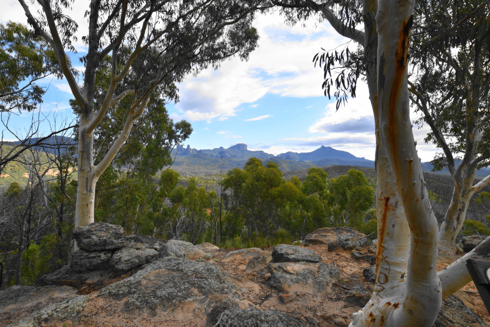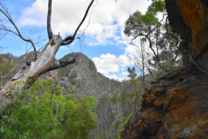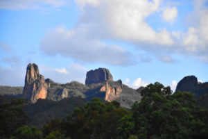 Heute kommen wir in eine total flache Gegend. Wir fahren ab vom Highway und kommen auf eine schmale Straße, die teilweise schnurgerade durch große Baumwollfelder führt. Wir fahren gemütlich mit 80 dahin, es ist kaum Verkehr. Allerdings regnet es zwischendurch so stark, dass wir fast stehen bleiben müssen. Aber es ist immer nur kurz und am frühen Nachmittag sind wir in Coonabarabran. Dort holen wir uns in der Touristeninformation Karten für den Warrumbungle Nationalpark. Das ist ein vulkanisches Gebiet, einzelne hohe Felsformationen überragen den Wald. 2013 wurde durch ein Buschfeuer 90% des Waldes zerstört. Aber während der letzten 4 Jahre ist es schon wieder erstaunlich nachgewachsen. Die Sonne scheint den restlichen Tag und wir haben einen schönen Blick auf die Felsen. Nachts ist über uns ein toller Sternenhimmel und im Hintergrund ein ständiges Gewitterleuchten.