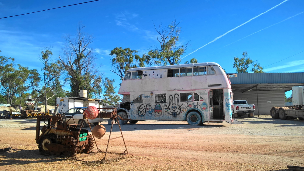 Wir sehen im Internet drei Campingmöglichkeiten. Bei der ersten ist es absolut tot und kein Mensch zu sehen. Wir fahren den 2. Platz an, in dem Pub arbeiten zwei Mädls und wissen von nichts. Aber sie schicken uns zum „Hilton“, nochmal 5km weg. Als wir dort ankommen, ist es schon fünf Uhr und das ganze Pub ist voller Leute. Wir können zwischen den Steinhaufen unser Auto abstellen zum Übernachten und dann genehmigen wir uns ein Bierchen. Es dauert nicht lang, und wir sitzen unter den Opalsuchern, Lastwagenfahrern und deren Frauen. Eine Frau mit Bart hat mich ins Herz geschlossen und spendiert mir gleich noch ein Bier. Es ist eine lustige Truppe und schon ganz schön angetrunken. Bei stockfinsterer Nacht und einem wunderbaren Sternenhimmel gehen wir beschwingt ins Bett.