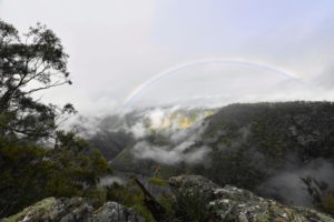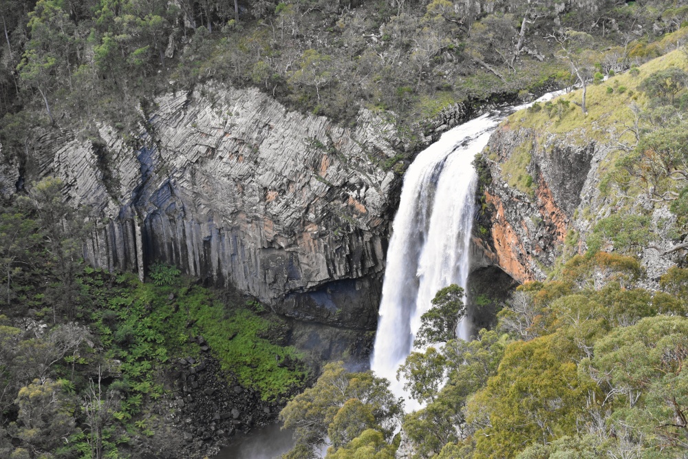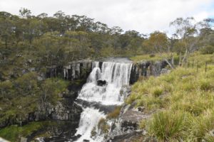 Wieder war die Nacht so kalt, dass ich eine lange Leggings anziehen musste, trotz warmer Bettdecke. Und das Frühstück findet drinnen statt, in der Früh haben wir keine Lust, nach draußen zu gehen. Aber die Sonne kommt dann doch kurz durch und wir laufen die Aussichtspunkte ab, von denen aus man die Wasserfälle sehen kann. Der Wollomombi-Wasserfall ist der zweithöchste Australiens mit 260m Höhe.