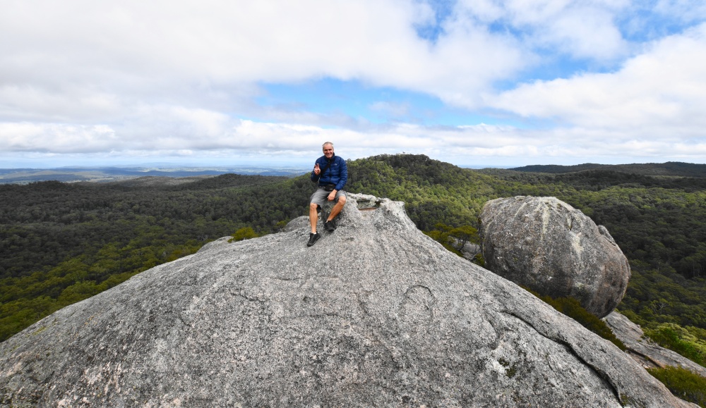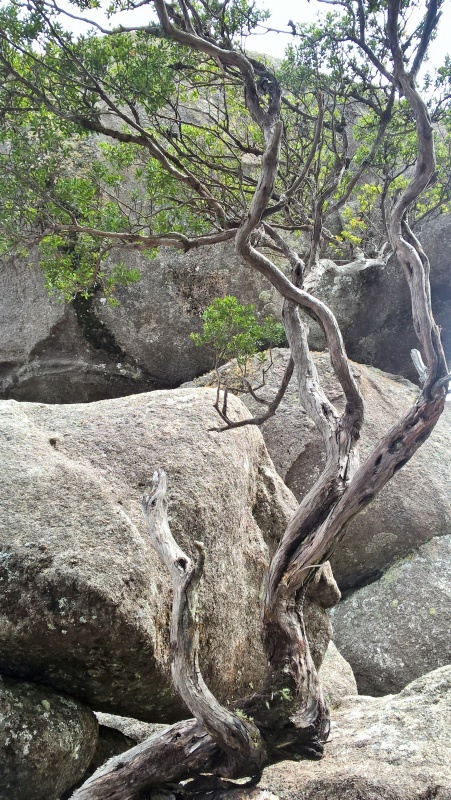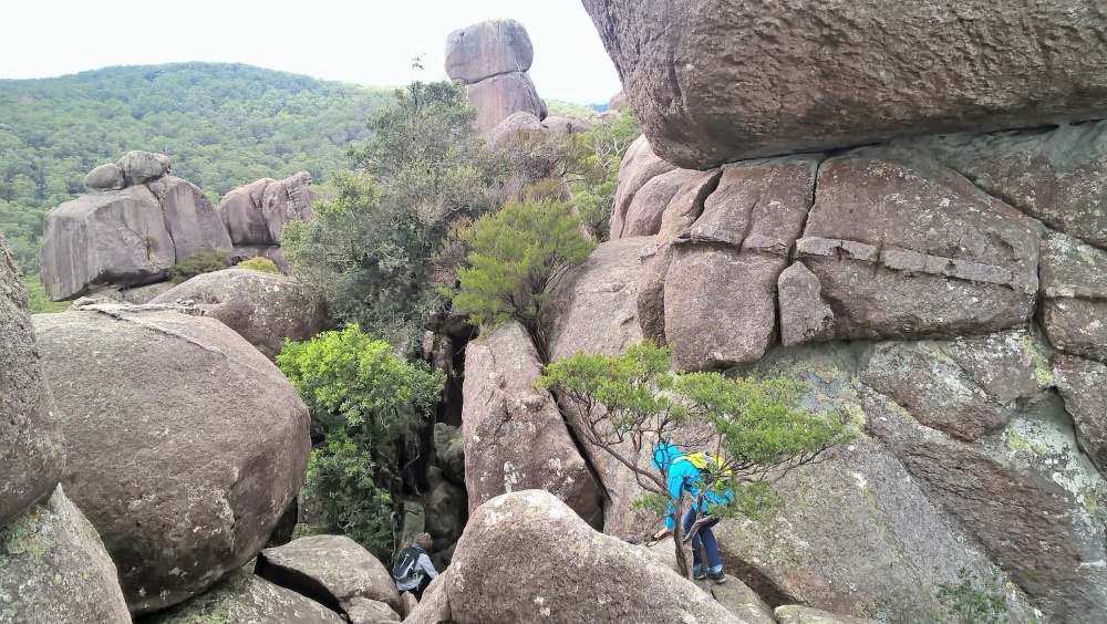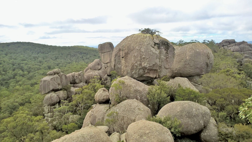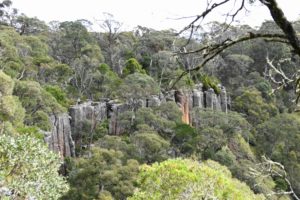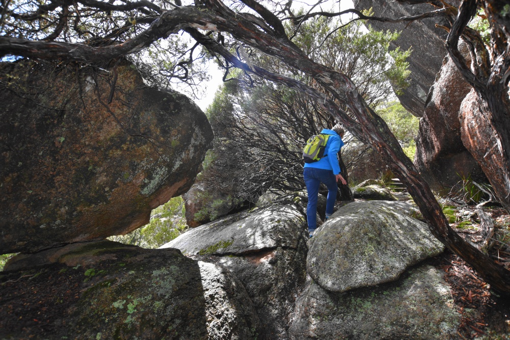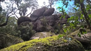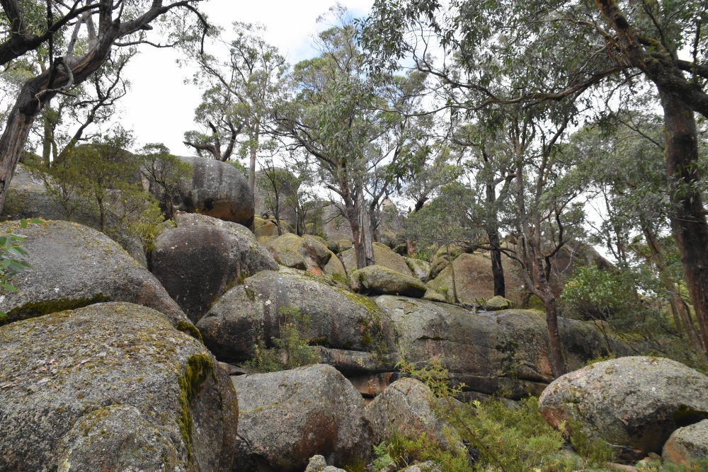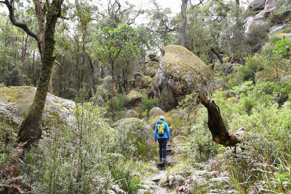 Es ist kalt, bewölkt, aber trocken. Wir fahren ungefähr 30km und kommen in den Cathedral-Nationalpark. Eine unbefestigte Straße führt zu einem Picknickplatz, von dem aus wir losmarschieren. Es geht durch ein verwunschenes Tal, lauter riesige, bemooste Felsen, genannt Woolpack Rocks, die Wollknäulfelsen, und auch die Bäume sind voller Moos.