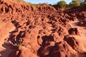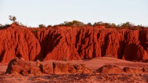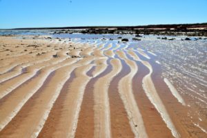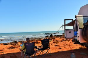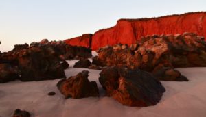 Die Schweizer haben uns vom James Price Point vorgeschwärmt, dorthin geht’s wieder über eine Sandpiste. Wir fahren die verschiedenen Strandstücke ab, bis wir endlich einen schönen Stellplatz finden. Ist garnicht so leicht, bei der Auswahl. Jetzt stehen wir an der Küste. Hinter uns die roten Klippen, vor uns viele Felsen und Steine im Wasser. Wir kommen uns vor wie auf dem Mond. Und hier können wir auch die Gezeiten beobachten, mit 11-18m der zweithöchste Tidenhub der Welt. Nur irgendwo in Kanada ist er noch höher. Heute gibt es wieder einmal einen traumhaften Sonnenuntergang und Sternenhimmel.