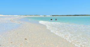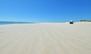Und einem Traumstrand. Knallweißer Sand, kaum Leute und ein blaues, warmes Wasser. Wir können mit dem Auto an den Strand fahren und trinken nach dem Schwimmen noch einen Kaffee. Dann kommt die Flut und damit die Wellen.