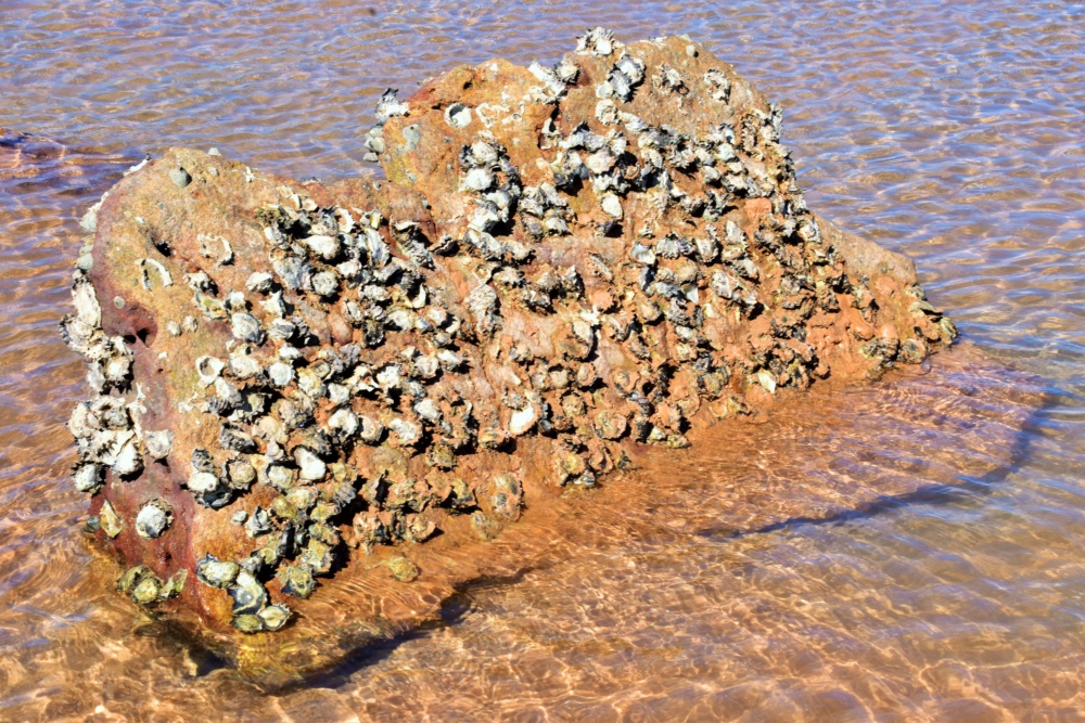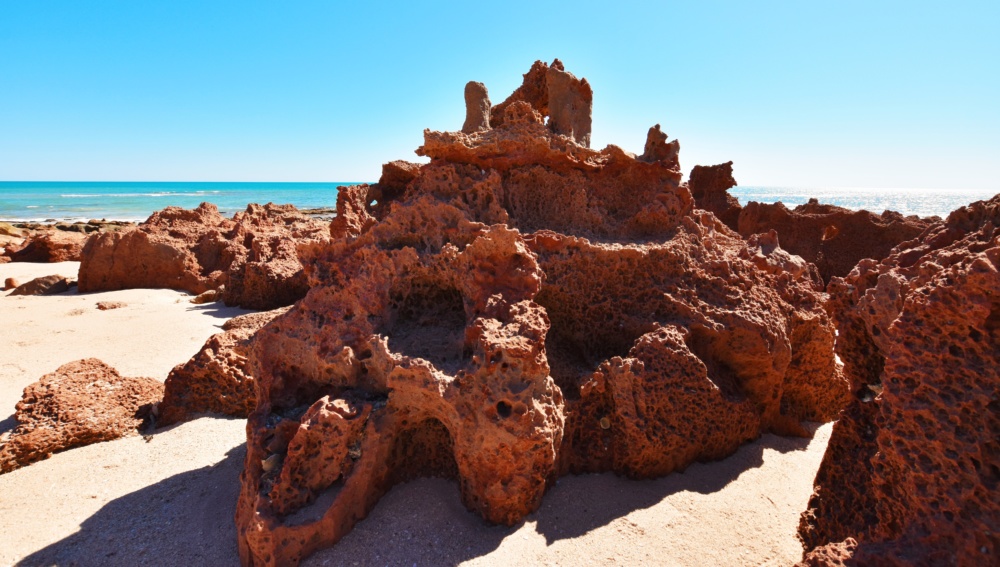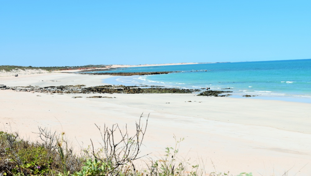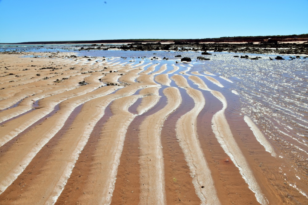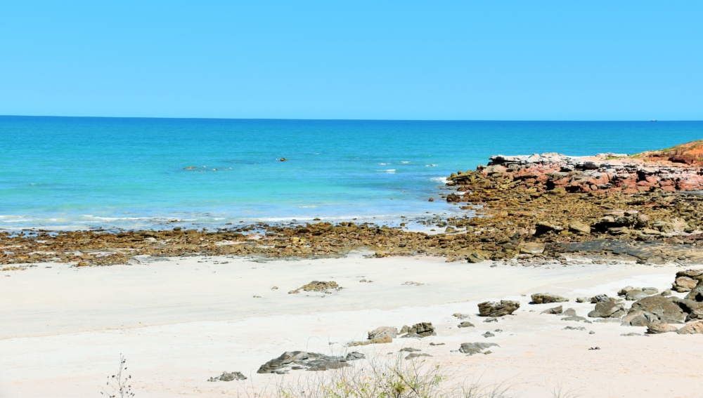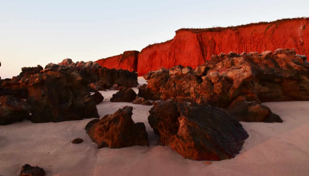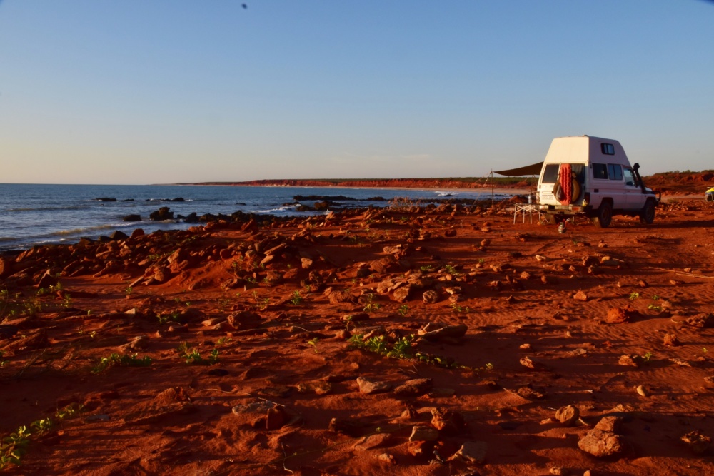 Die Schweizer haben uns vom James Price Point vorgeschwärmt, dorthin geht’s wieder über eine Sandpiste. Wir fahren die verschiedenen Strandstücke ab, bis wir endlich einen schönen Stellplatz finden. Ist garnicht so leicht, bei der Auswahl. Jetzt stehen wir an der Küste. Hinter uns die roten Klippen, vor uns viele Felsen und Steine im Wasser. Wir kommen uns vor wie auf dem Mond. Und hier können wir auch die Gezeiten beobachten, mit 11-18m der zweithöchste Tidenhub der Welt. Nur irgendwo in Kanada ist er noch höher. Heute gibt es wieder einmal einen traumhaften Sonnenuntergang und Sternenhimmel.