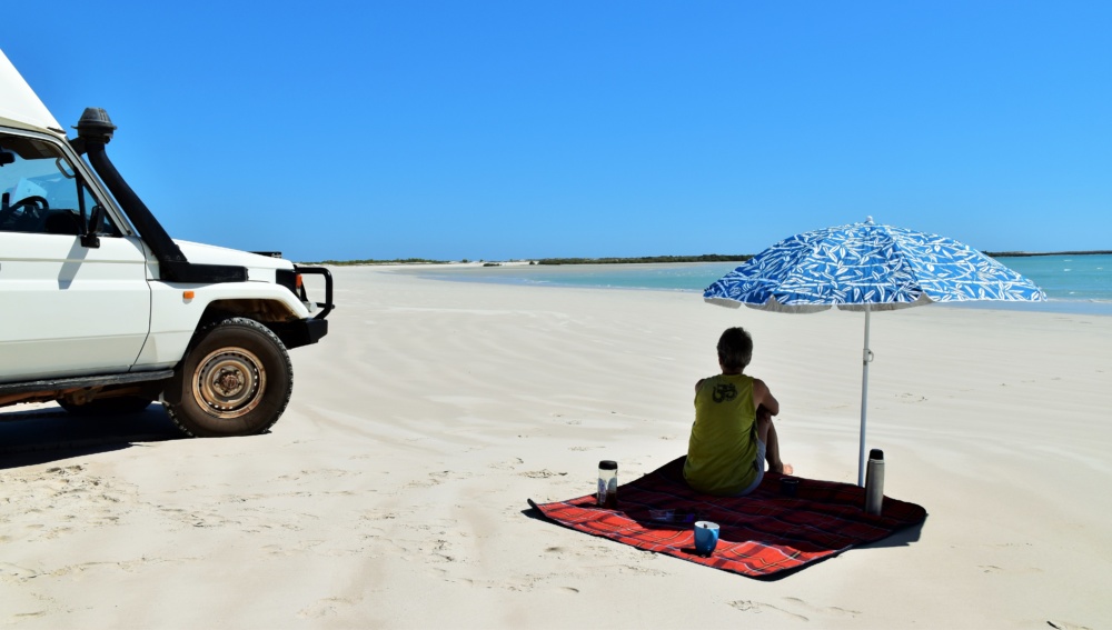 Und einem Traumstrand. Knallweißer Sand, kaum Leute und ein blaues, warmes Wasser. Wir können mit dem Auto an den Strand fahren und trinken nach dem Schwimmen noch einen Kaffee. Dann kommt die Flut und damit die Wellen.
