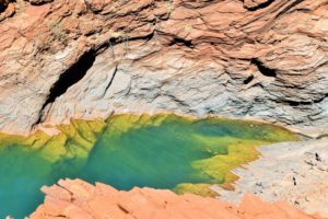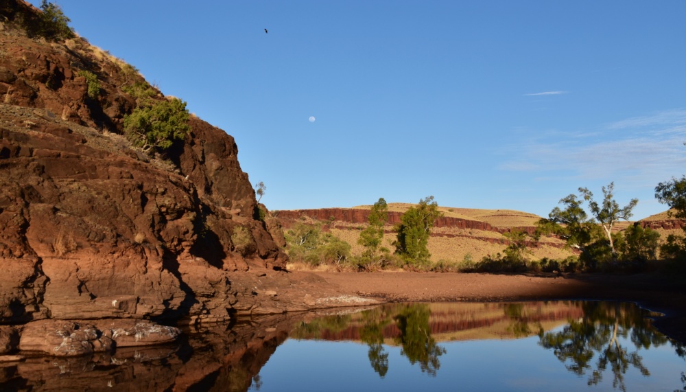 Nach einem Ruhetag um mich an meine Zahnlücke zu gewöhnen, geht’s heute weiter. Von Tom Price zur Hamersley Gorge führt eine ganz gute, nicht asphaltierte Straße. Es sind nur 67km und wir sind mittags schon dort.