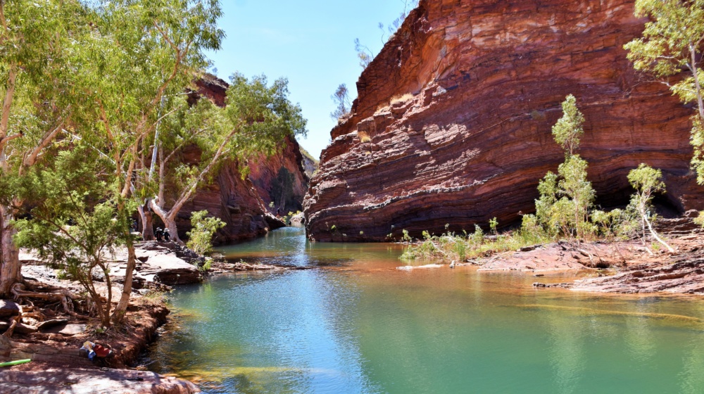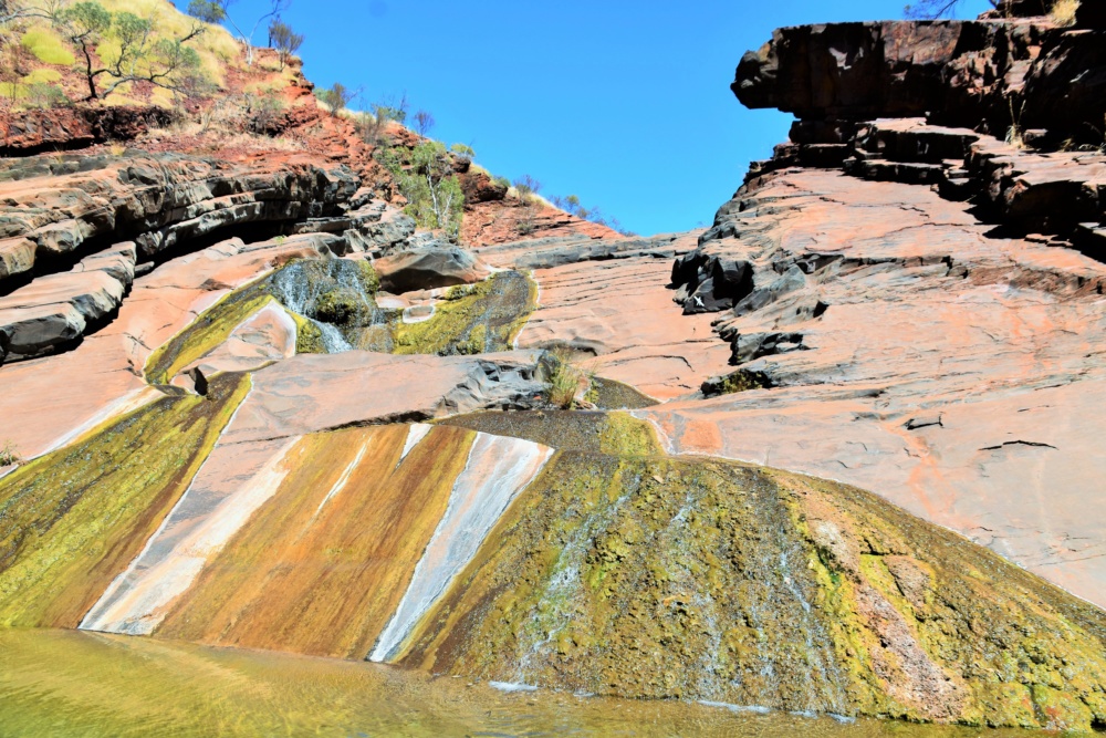 Zur Schlucht geht ein kurzes Stück hinunter und man hat einen tollen Blick auf gefaltete, rot-schwarze Gesteinsschichten. Die Schlucht gehört zwar zum Karijini Nationalpark, die Felsen sind aber ganz anders. Wir steigen zu einem Pool hinauf und treffen dort Janett und Mark wieder. Sie haben die gleiche Route und sind einem Ratsch nicht abgeneigt. Man kann hier schwimmen, das Wasser ist nicht zu kalt. Etwas unterhalb ist ein großes Becken und von dort aus kann man in eine schmalere Schlucht schwimmen. Ich überwinde mich und obwohl das Wasser sehr frisch ist, schwimme ich mit Tomi durch die Felsen. Ein toller Blick!