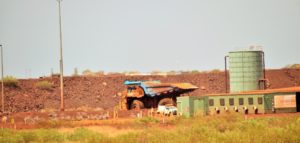 Frühstück, Morgenschwimmen, Duschen im Schwimmbad, wir machen uns auf den Weg nach Exmouth. Eine gute, aspaltierte Straße, viele Roadtrains im Gegenverkehr und eine schöne Landschaft. Wir kommen an einer großen Mine vorbei, leider sehen wir nur ein paar 190 Tonnen-Laster vorbeifahren. Hier werden im Jahr 25Mio. Tonnen Eisenerz in einer offenen Mine abgebaut.